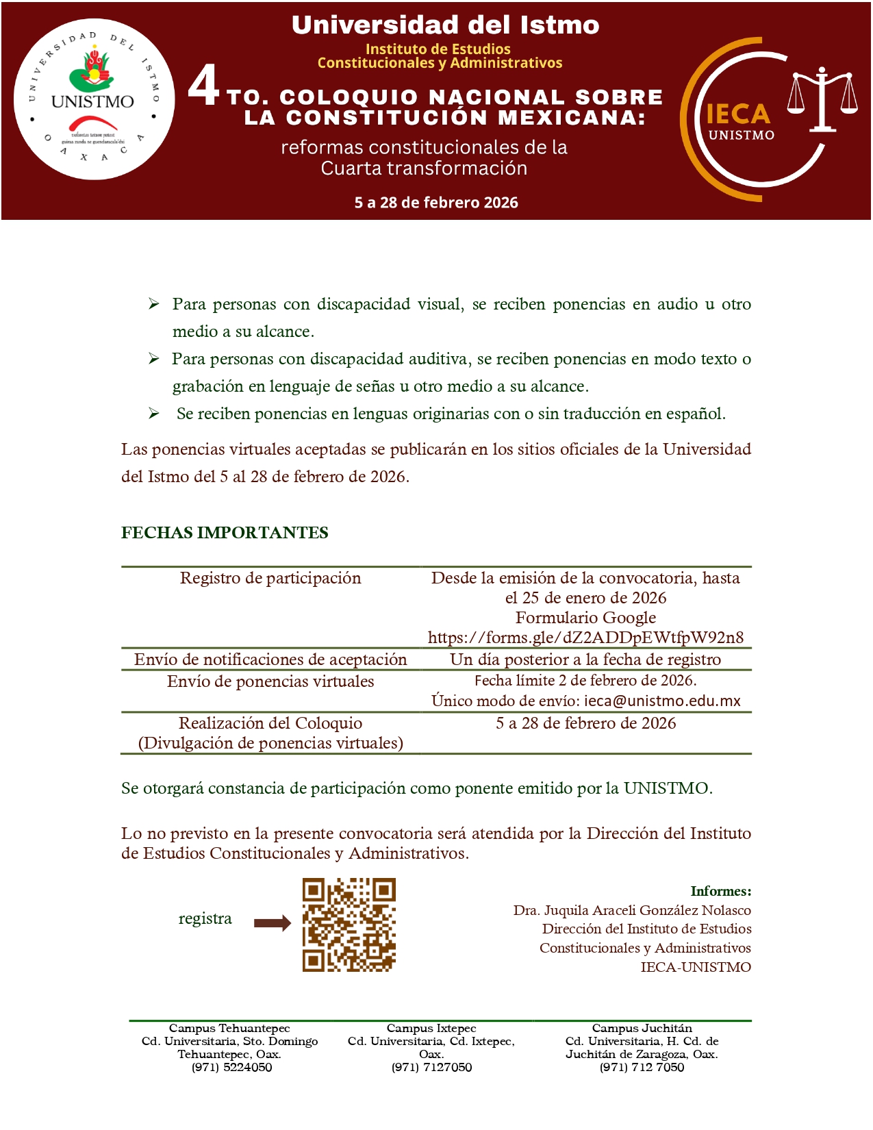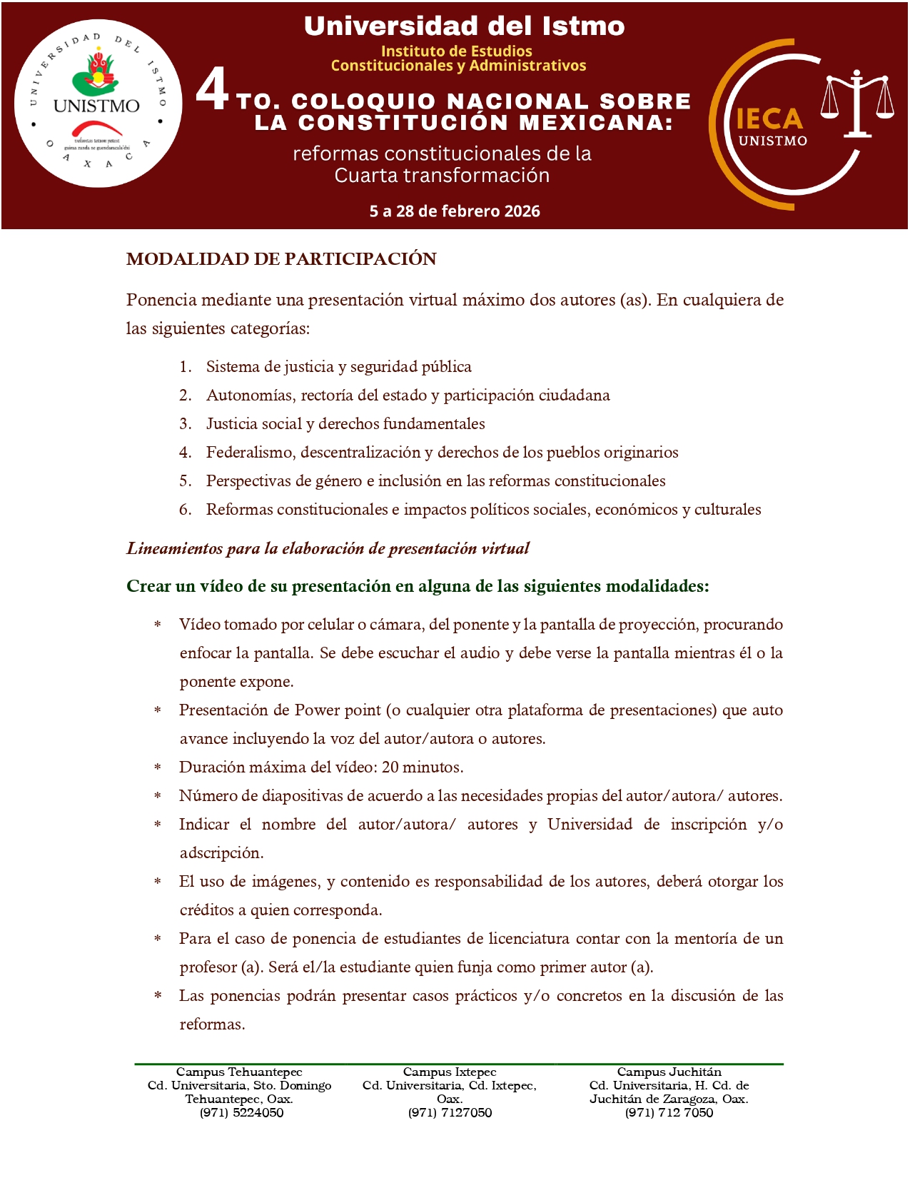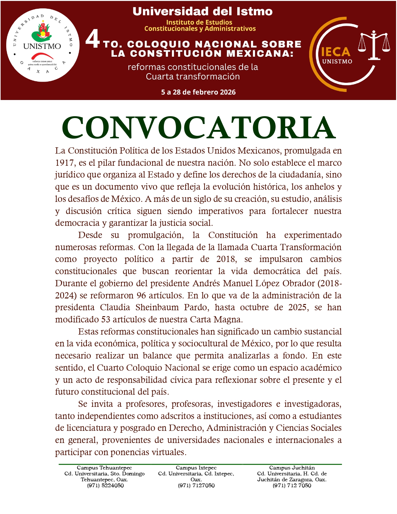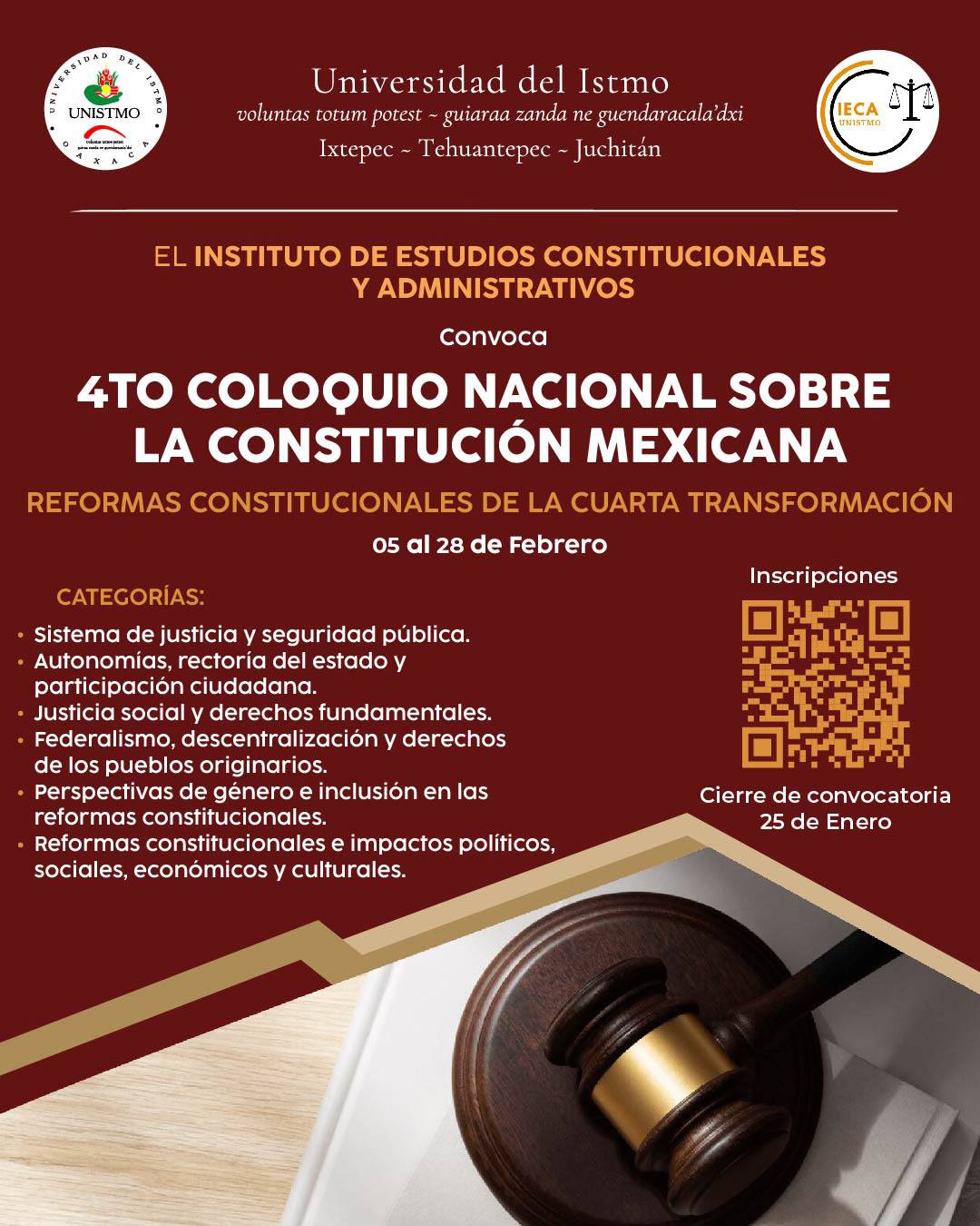 La Universidad del Istmo, a través del Instituto de Estudios Constitucionales y Administrativos, les comparte la convocatoria del 4.º Coloquio Nacional sobre la Constitución Mexicana: Reformas constitucionales de la Cuarta Transformación, que se llevará a cabo del 5 al 28 de febrero.
