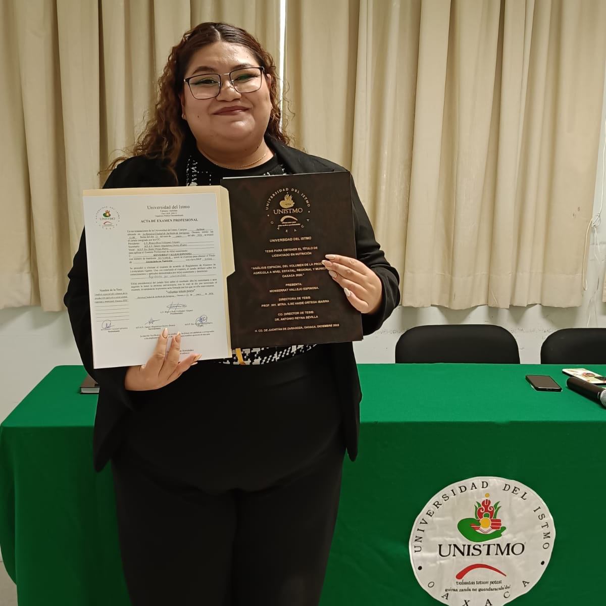 Este 23 de enero, Monserrat realizó su examen profesional con la presentación de su tesis: “Análisis espacial del volumen de la producción agrícola a nivel estatal, regional y municipal, Oaxaca”, con este trabajo obtuvo el título en Lic. en Nutrición.